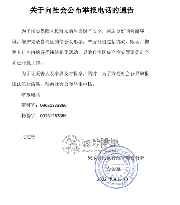 缅甸果敢关于向社会公布举报电话的通告 |